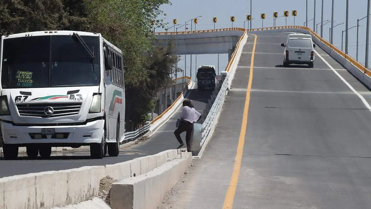 En ambos sentidos del puente vehicular, de Amozoc hacia el Centro Histórico de Puebla y viceversa, hace falta infraestructura accesible para trabajadores, estudiantes y vecinos, que se arriesgan cada día buscando brechas entre el tráfico para atravesar la vialidad.