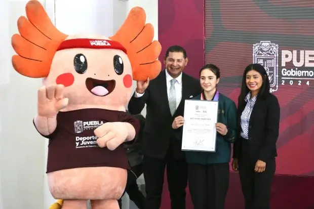 Al entregar un reconocimiento a la destacada atleta poblana María José Estrada Planell, quien obtuvo la medalla de oro en escalada deportiva durante la Olimpiada Nacional CONADE 2026, de la que Puebla funge como sede principal, el gobernador Alejandro Armenta Mier destacó que la entidad es referente en la organización de eventos deportivos.